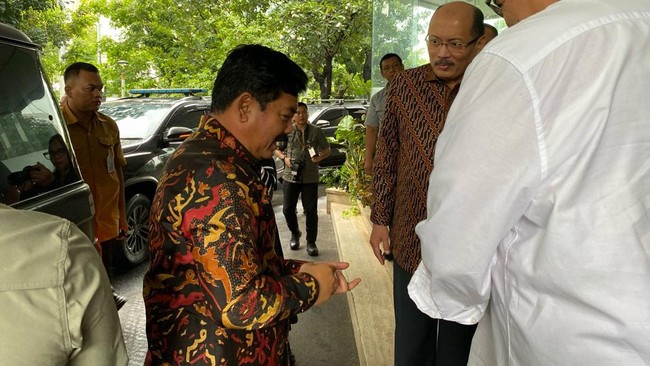 Pantauan detikcom di kantor PGI, Jalan Salemba Raya No 10, Jakarta Pusat, Rabu (28/2/2024), Hadi tiba pukul 11.32 WIB dan berpakaian batik.
