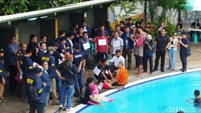 Adegan tersebut direka ulang pada adegan ke-45. Rekonstruksi dilakukan di kolam renang di kawasan Duren Sawit, Jakarta Timur, pada Rabu (28/2/2024).