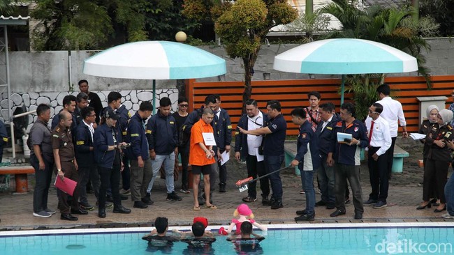 "Adegan yang diperagakan saat rekonstruksi di kolam renang sebanyak 102 adegan, yang mana dari 102 adegan terdapat 69 adegan di mana selama 69 adegan itu tersangka selama 12 kali menenggelamkan korban," kata Kombes Wira di kolam renang Taman Palem, Rabu (28/2)