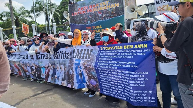 Massa yang menamakan diri Front Rakyat Semesta (FRS) serta Bunda & Emak Militan (BEM) AMIN menggelar demonstrasi di depan Gedung DPR RI. Lalu lintas di Jalan Gatot Subroto dari Semanggi arah Tomang pun macet.
