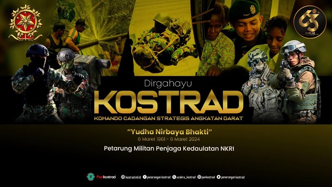 Hari Ulang Tahun (HUT) Komando Cadangan Strategis TNI Angkatan Darat (Kostrad) akan diperingati pada 6 Maret. Dalam rangka memperingatinya, twibbon telah dibagikan.