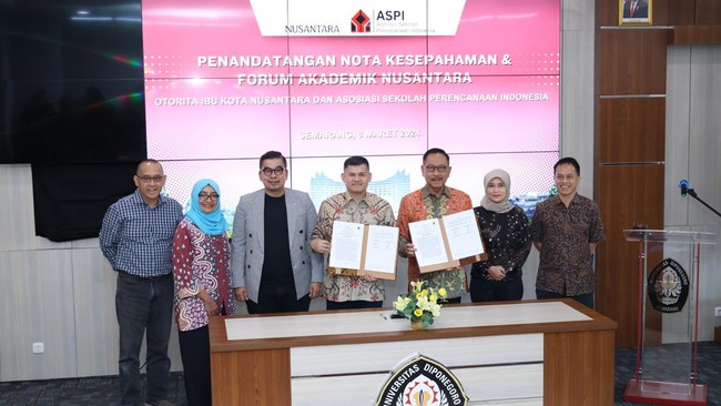 Otorita Ibu Kota Nusantara (IKN) dan Asosiasi Sekolah Perencanaan Indonesia (ASPI) melakukan penandatangan nota kesepahaman di kampus Universitas Diponegoro (UNDIP), Semarang, hari ini. Kerja sama ini bertujuan untuk mengawal pembangunan IKN.
