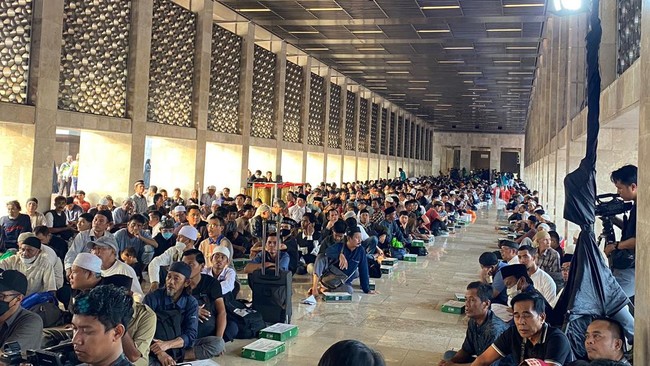 Masjid Istiqlal di Jakarta Pusat mulai dipadati warga yang hendak mengikuti buka puasa bersama. Salah satu warga asal Jawa Timur, Ridwan (29), mengaku ikut bukber di Istiqlal untuk mengobati rindu buka bersama keluarganya.