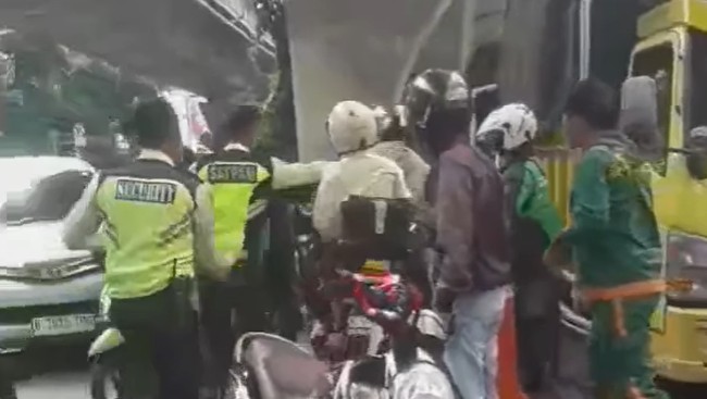 Aksi tersebut pun menjadi tontonan pengendara lain yang melintas. Terlihat arus lalu lintas macet akibat peristiwa percekcokan yang terjadi.