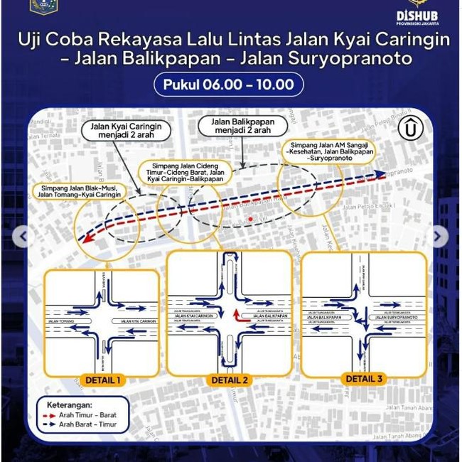 "Sehubungan dengan akan dilaksanakan Rekayasa Lalu Lintas di Jalan Kyai Caringin -Jalan Balikpapan dan Jalan Suryopranoto maka Dinas Perhubungan Provinsi DKI Jakarta melakukan rekayasa lalu lintas dimulai pada 15 Maret 2024 selama 1 (satu) minggu," demikian informasi yang disampaikan @dishubdkijakarta melalui akun Instagramnya, Jumat (15/3/2024).