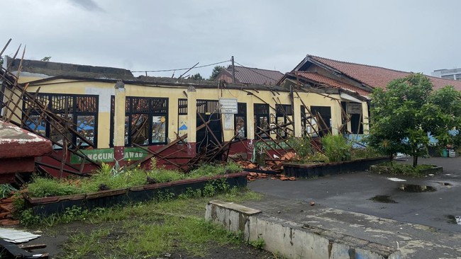 Tampak bangunan itu sudah tidak memiliki atap. Genteng sudah hancur berserakan di permukaan lantai. Tampak kayu-kayu penopang genteng juga patah imbas ambruk tersebut.