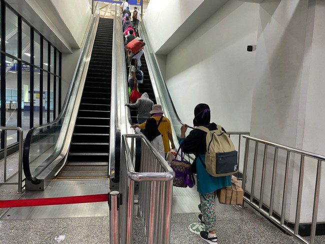 Terlihat seorang wanita bersama keluarganya membawa 3 tas mengantre menaiki satu eskalator ke peron 11-12 yang masih menyala. Ada juga lansia yang turun dari peron 11-12 melewati tangga biasa sambil menggunakan tongkat.
