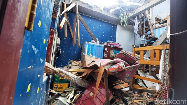 Di sana ada kasur dan bed cover yang sudah tertimpa runtuhan tembok tersebut. Begitu juga dengan perabotan lainnya seperti kipas angin dan lemari pakaian.