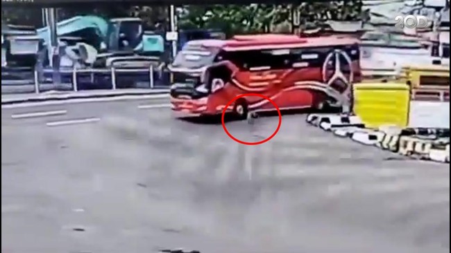 Bus terus melaju memasuki dermaga eksekutif, sementara korban terus berlari di samping bus. Korban terlindas di sebelah kiri belakang bus.