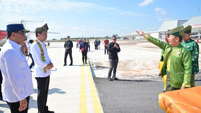 Tampak menyambut kedatangan Jokowi, Menteri Perhubungan Budi Karya Sumadi, Pj Gubernur Kalimantan Barat Harisson, Pangdam XII/Tanjungpura Mayjen TNI Iwan Setiawan, Kapolda Kalimantan Barat Irjen Pipit Rismanto, Danlanud Harry Hadisoemantri Letkol Pnb Dion Aridito, serta Pj Wali Kota Singkawang Sumastro.