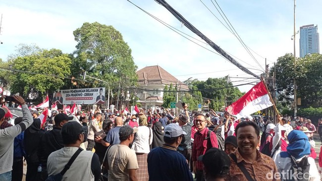 Pantauan di lokasi, Rabu (20/3/2024), massa aksi datang dari arah utara dengan berjalan kaki. Beberapa di antaranya ada yang mengenakan sarung, serban, hingga membawa bendera Merah Putih.