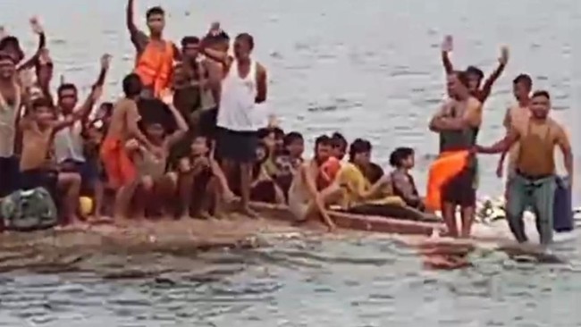 Dalam video dilihat detikSumut, Rabu (20/3/2024), puluhan pria tampak bertahan di atas kapal yang hampir tidak kelihatan. Mereka ramai-ramai melambaikan tangan meminta pertolongan.