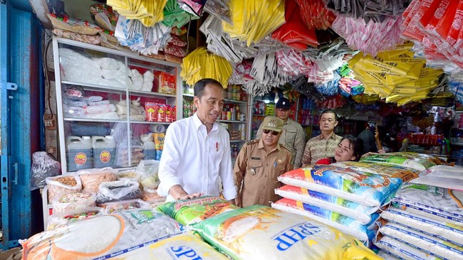 Presiden Joko Widodo (Jokowi) meninjau Pasar Sungai Ringin, Sekadau, Kalimantan Barat, untuk memeriksa stabilitas harga dan ketersediaan bahan pokok. Jokowi menyebut ada kenaikan pada beberapa bahan pokok di pasar tersebut, tapi masih dalam kondisi stabil.