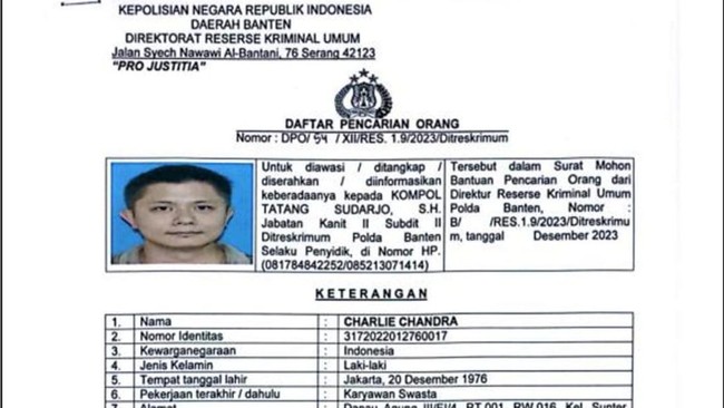 Didik menjelaskan duduk perkara kasus perkara Charlie Chandra yang menjadi DPO polisi. Kasus yang menimpanya dilaporkan ahli waris The Pit Nio di Polda Metro Jaya dan dilimpahkan ke Polda Banten karena lokusnya ada di wilayah Banten.