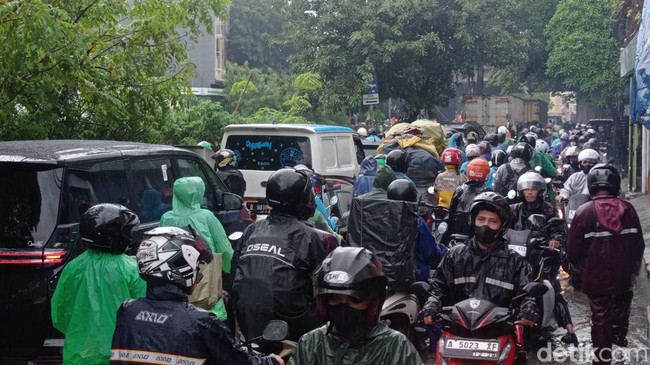 Mobil dan motor mulai dapat melaju dengan kecepatan di bawah 10 km/jam. Saat ini terpantau kondisi cuaca masih gerimis.