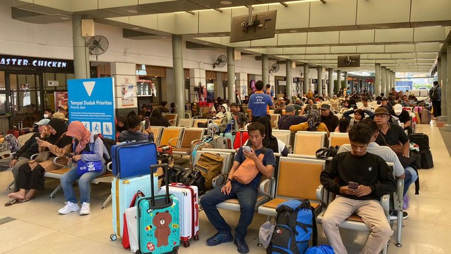 Pantauan detikcom di Stasiun Pasar Senen, Jakarta, Sabtu (23/3/2024) pukul 10.20 WIB, penumpang terus berdatangan membawa tas hingga koper yang ditentengnya. Meskipun ramai, kondisi Stasiun Pasar Senen belum sampai berdesak-desakan.