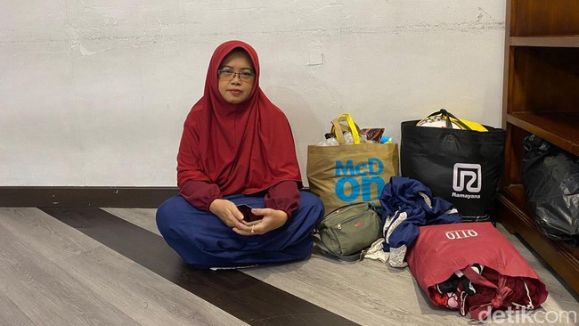 Nur memutuskan menunggu kedatangan kereta api di pojokan musala stasiun sambil membawa tiga tas jinjing bawaannya. Meskipun menerima nasib, raut kesedihan tetap tampak di wajahnya.