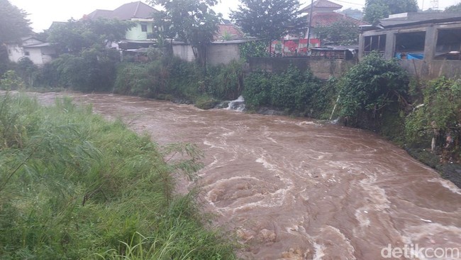 Air Sungai Ciliwung terlihat berwarna cokelat pekat karena dampak hujan deras. Debit air juga tampak meningkat.