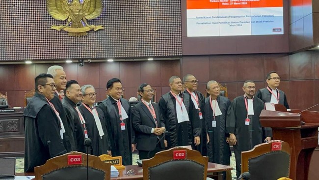 Pasangan calon nomor urut 3 Ganjar Pranowo dan Mahfud Md menghadiri sidang perdana sengketa Pilpres 2024. Sebelum sidang dimulai, Ganjar-Mahfud berfoto bersama dengan tim kuasa hukum Prabowo Subianto-Gibran Rakabuming Raka.
