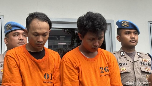 Sebanyak 2 dari 3 tersangka ditampilkan di hadapan para awak media. Keduanya sudah mengenakan baju tahanan berwarna oranye. Kedua tangannya pun sudah di borgol.