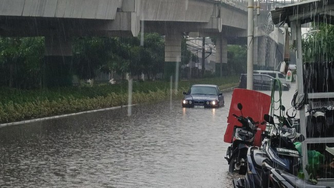 Banjir sempat merendam jalan raya di bawah flyover Tanjung Barat, Jakarta Selatan, sore tadi. Banjir mengakibatkan motor dan mobil yang melintas alami gangguan mesin hingga mogok.