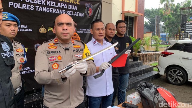 Pedang tersebut ditampilkan polisi dalam konferensi pers yang digelar di halaman Polsek Kelapa Dua, Tangerang. Tampak pedang tersebut berbahan stainless steel dengan bilah bagian tajam sekitar 20 cm.