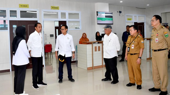 Presiden Joko Widodo (Jokowi) meninjau Rumah Sakit Umum Daerah (RSUD) Sultan Thaha Saifuddin, Kabupaten Tebo, Jambi. Jokowi memuji tata ruang RSUD tersebut cukup bagus dan bersih.