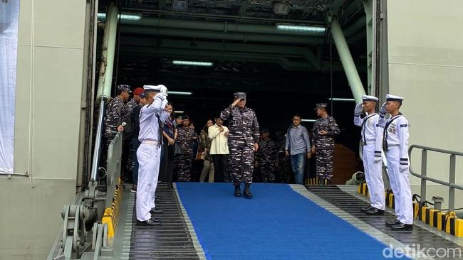 Pantauan detikcom di Kolinlamil, Tanjung Priok, Jakarta Utara pada Jumat (5/4/2024) pukul 07.51 WIB, Ali memasuki kapal perang tersebut untuk meninjau para pemudik di dalamnya.