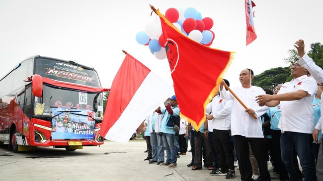 Relawan Pro Jokowi (Projo) menggelar mudik gratis 2024. Sebanyak 5.000 pemudik diberangkatkan dari Taman Mini Indonesia Indah (TMII) dengan tujuan Jawa Tengah, Yogyakarta, dan Jawa Timur.