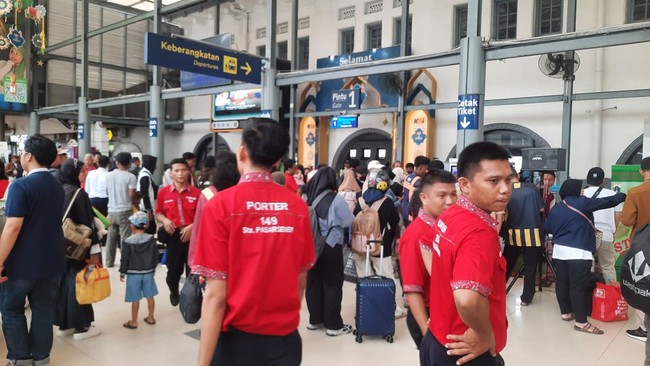 Memasuki H-5 Lebaran, kondisi di Stasiun Pasar Senen, Jakarta Pusat, ramai pemudik. Bukan hal baru jika di sejumlah stasiun terdapat banyak porter bertebaran, apalagi menjelang musim lebaran.