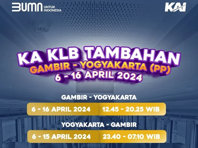 PT KAI menginformasikan kereta api (KA) tambahan untuk perjalanan Jakarta - Yogyakarta. Kereta tambahan ini beroperasi untuk relasi Gambir - Yogyakarta sebagai angkutan Lebaran 2024.