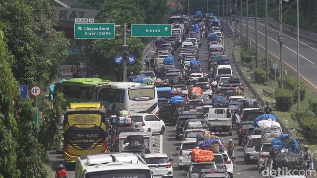 Lalu lintas di Jalan Tol Tangerang-Merak masih mengalami kemacetan panjang hari ini. Pemudik terjebak macet berjam-berjam menuju Pelabuhan Merak.