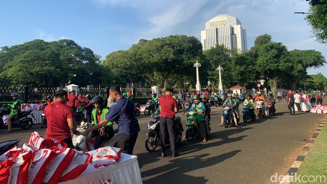 Sejumlah pengendara sepeda motor, dari ojek online hingga warga biasa, yang melintas depan Istana tampak berhenti. Mereka berbaris mengantre dengan tertib untuk mengambil sembako.