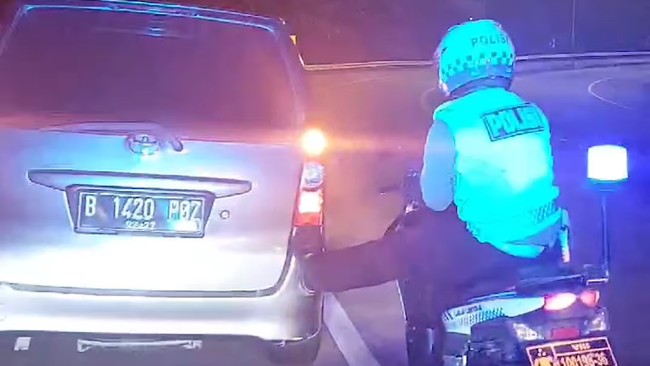 Polisi itu mendorong mobil dengan cara kaki kiri menempel pada bagian belakang minibus. Yang tak biasa, jelas petugas kepolisian tersebut mendorong minibus sambil mengendarai sepeda motor.
