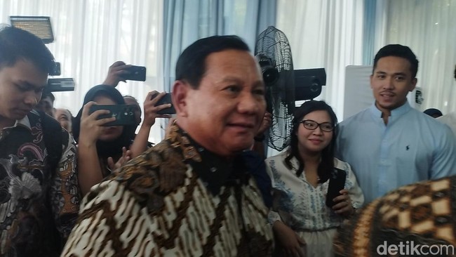 Pantauan detikcom di Jl Denpasar Raya E3, Jakarta Selatan, Kamis (11/4/2024), Prabowo tiba di lokasi pada pukul 13.47 WIB. Ia mengenakan baju batik cokelat.