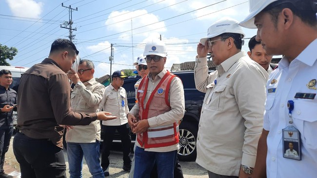 Budi tampak mengenakan rompi APD lapangan dan topi. Ia menaiki sebuah kereta lori untuk mengecek perkembangan pembangunan.