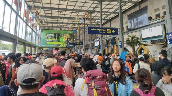 Pantauan detikcom di Stasiun Pasar Senen, Jakarta Pusat, Senin (15/4/2025) pukul 09.50 WIB, antrean masyarakat di pintu kedatangan mulai mengular. Tampak kendaraan roda empat juga mulai memadati zona penjemputan.