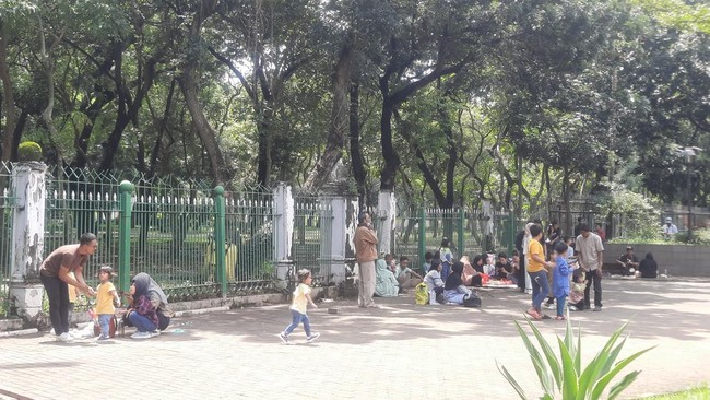 Pantauan detikcom di Monas, Senin (15/4), sejumlah warga tampak menggelar tikar di trotoar dekat pagar kawasan Monas. Mereka tampak duduk sambil menikmati makanan yang mereka bawa.