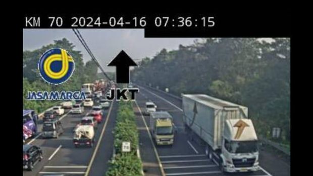 Berdasarkan pantauan melalui aplikasi Travoy, Selasa (16/4/2024), pukul 07.24 WIB, kemacetan mulai terjadi di KM 70, macet masih terlihat di KM 69+400, macet juga masih terjadi di 68+500.