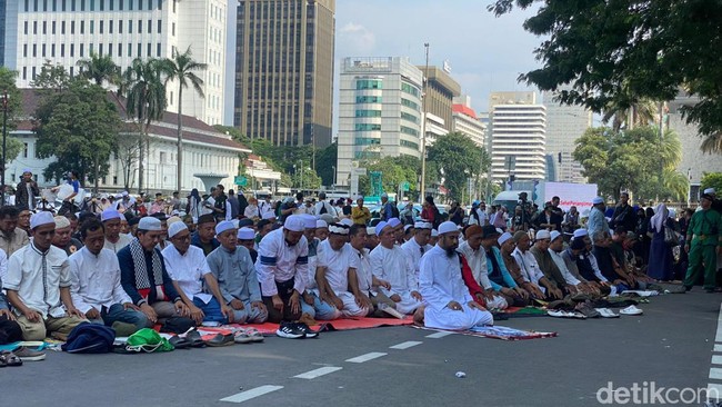 Pantauan detikcom, Selasa (16/4/2024), pukul 15.20 WIB massa aksi mulai diarahkan untuk melaksanakan salat asar berjemaah. Massa lalu menggelar berbagai macam alas untuk beribadah.