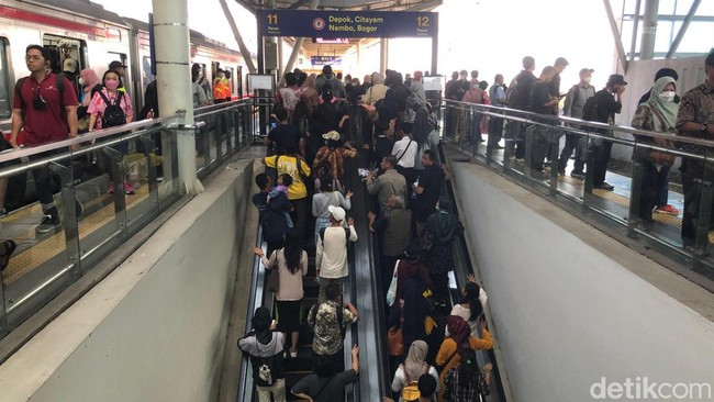 Pantauan di lokasi pukul 17.30 WIB, Selasa (16/4/2024), Peron 11 dan 12 dengan KRL tujuan Depok, Citayam, Nambo, dan Bogor terpantau ramai. Peron ini didominasi pengguna KRL yang baru pulang bekerja dan pemudik arus balik.
