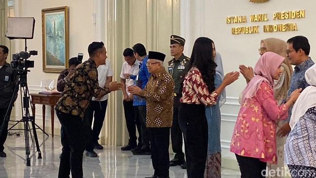 Para pejabat dan pegawai bergiliran bersalaman dengan Ma'ruf Amin. Ma'ruf Amin juga bersalaman dengan awak media.