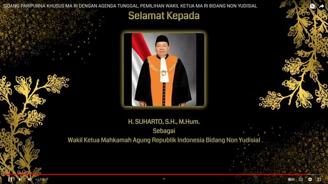 "Saya atas nama pimpinan MA mengucapkan selamat kepada Yang Mulia hakim agung Suharto atas terpilihnya sebagai Wakil Ketua MA bidang non-yudisial yang baru. Semoga dengan terisi jabatan wakil ketua MA non-yudisial akan membawa perubahan positif bagi MA dan lembaga peradilan ke depan," ucapnya.