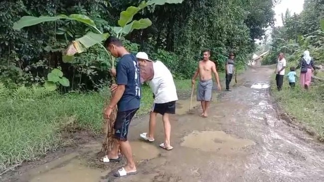 Warga di Desa Sukarendah, Kecamatan Warunggunung, Lebak, Banten, memprotes jalan rusak dengan menanam pohon pisang dan menebar ikan lele. Aksi ini dilakukan karena kondisi jalan tak kunjung diperbaiki.
