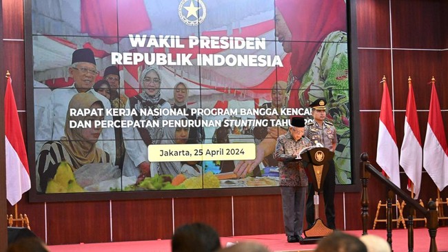 "Daya saing bangsa bertumpu pada mutu sumber daya manusianya. Menyadari hal ini, pemerintah telah menetapkan percepatan penurunan stunting menjadi prioritas utama," ujar Ma'ruf dalam sambutannya di Rakernas Program Bangga Kencana dan Percepatan Penurunan Stunting Tahun 2024 di di Auditorium BKKBN, Jakarta, Kamis (25/4/2024).