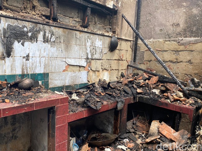 Tampak toko agen yang menjual galon air mineral tersebut sudah hangus dan tersisa kemasannya saja. Tampak area dapur juga sudah luluh lantak.