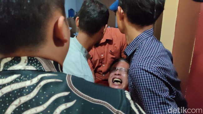 Polisi sempat menenangkan pelaku karena menangis. Tersangka yang tidak mau diam lanjut menangis saat dibawa ke ruangan Humas Polda Banten.