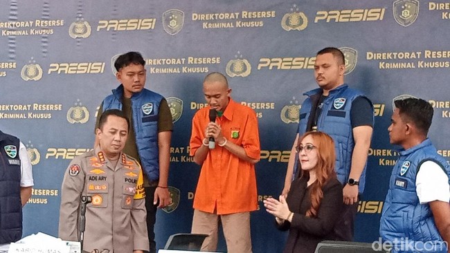 Pria asal Bekasi ini tampak memakai baju tahanan berwarna oranye. Kedua tangannya terikat kabel ties.