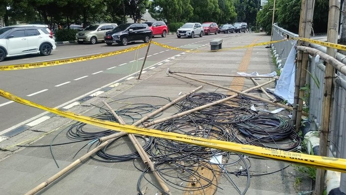Pantauan detikcom, Sabtu (27/4/2024), lokasinya tepat berada di trotoar jalan raya. Terdapat kabel-kabel semrawut dan bambu di atas trotoar tersebut.