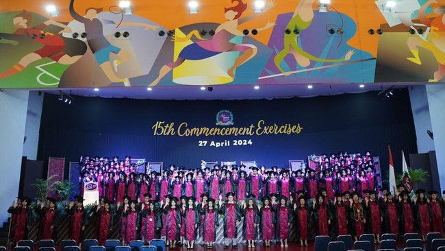 Siswa kelas 12 BINUS SCHOOL Serpong menggelar wisuda batch 15 yang dilaksanakan di Sjuman Hall, BINUS SCHOOL Serpong, Tangerang Selatan, Sabtu (27/4/2024). Dari siswa yang lulus tahun ini, terdapat 21% alumni melanjutkan pendidikannya di Eropa, Asia 19%, Australia 18%, Indonesia 36%, Kanada 4%, Amerika Serikat 2%.